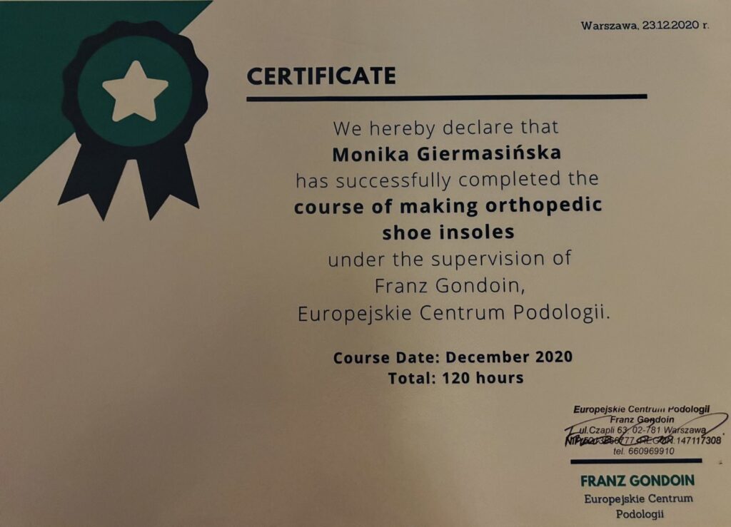 • 2022 – Dobra szkoła ortopodologii-metodologia badan stóp i kończyn dolnych i projektowanie indywidualnych wkładek ortopedycznych.